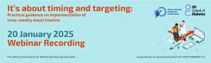 El 20 de enero de 2025, la Federación Internacional de Diabetes FID y el Instituto de Educación Médica y de Enfermería (IMNE) coorganizaron el seminario web "Es cuestión de tiempo y de orientación: Guía práctica para la implementación de insulinas basales una vez a la semana",dirigido a endocrinólogos, diabetólogos y especialistas en medicina de familia. Aunque existen tratamientos no insulínicos, muchas personas diabéticas seguirán necesitando insulina a medida que avance la diabetes de tipo 2 (DMT2).