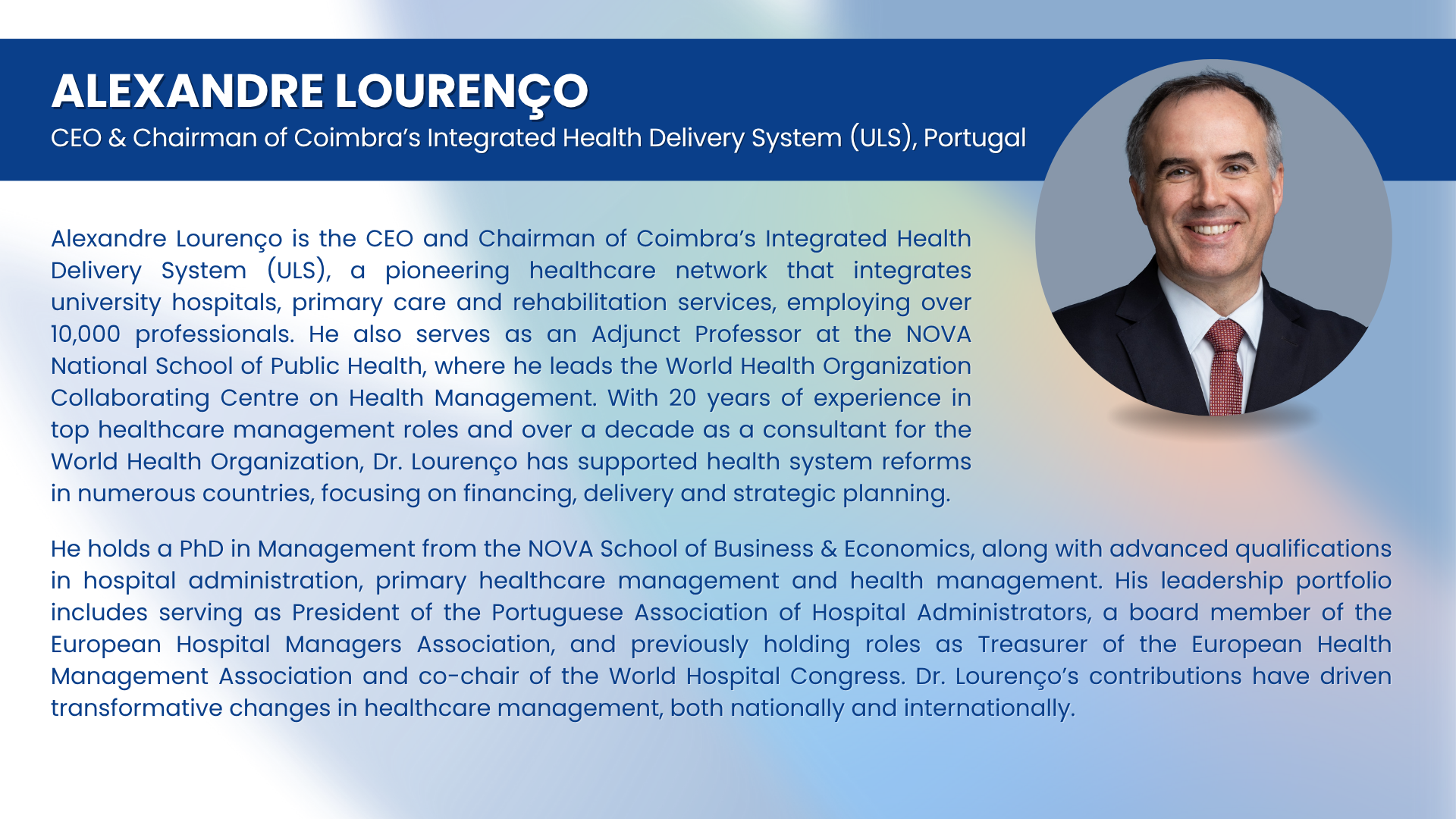- Integration of population-based care and management through local health unit | Prof Alexandre Lourenço, CEO and Chairman of Coimbra’s Integrated Health Delivery System (ULS), Portugal