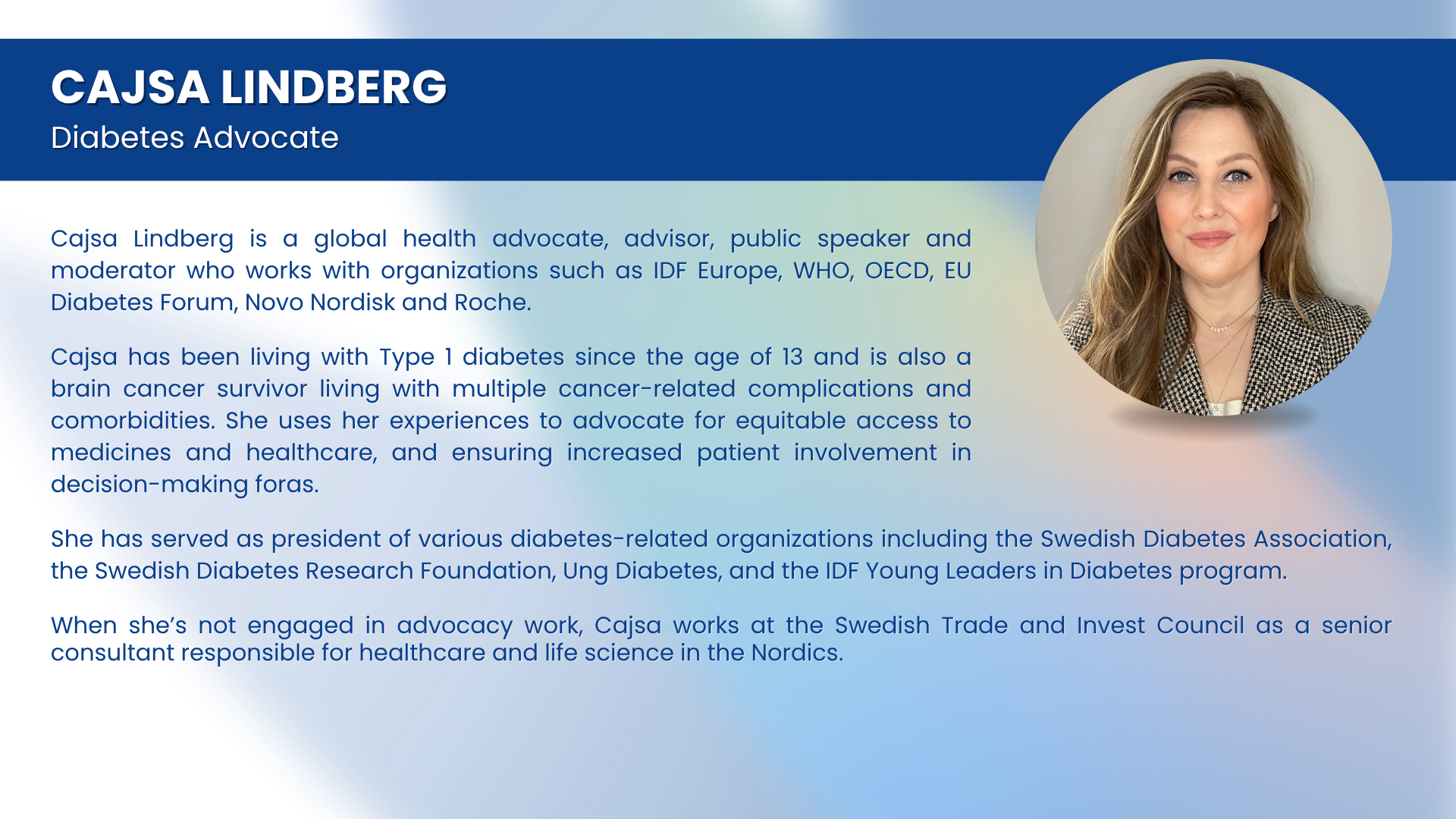 - Ms Cajsa Lindberg, T1D Advocate