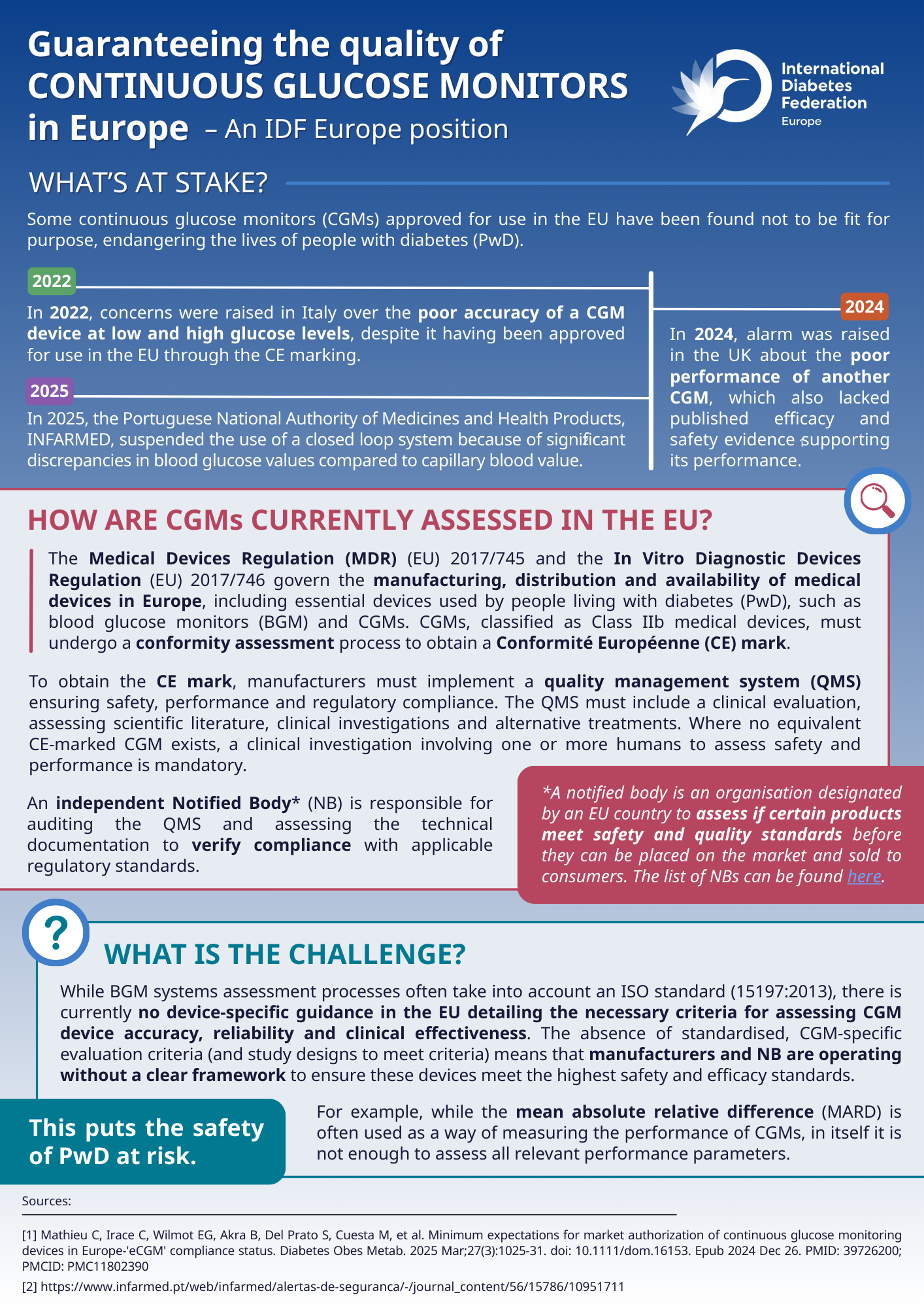 Because of these benefits and the key role CGMs now play in diabetes self-management, it is critical that they meet high accuracy and performance standards. Recently, some CE-marked CGMs have been found not to be fit for purpose, putting PwD at risk. Ensuring the CE-marking process is robust and capable of safeguarding people who rely on medical devices is therefore crucial. Yet, at EU level, no device-specific guidance currently defines the criteria for evaluating CGM accuracy, reliability and clinical effectiveness.