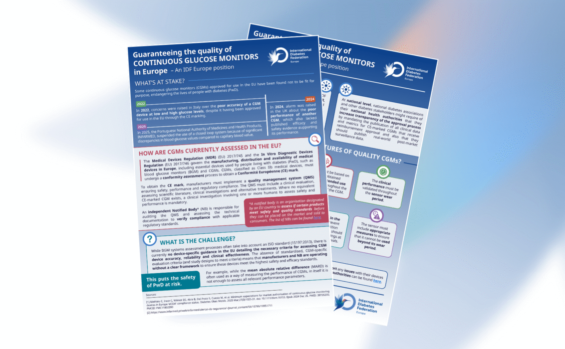 For this reason, IDF Europe has been calling for amendments to the Medical Devices Regulation (MDR) to strengthen oversight and establish EU-wide standards for CGMs, including through a response to the targeted revision of EU rules for Medical Devices and In Vitro Diagnostics. In parallel, IDF Europe has developed a two-page document for its member associations, outlining its position on the need to guaranteeing the quality of CGMs in Europe. The document supports national members by explaining how CGMs are currently assessed in the EU, outlining the main challenges, guiding them on how to report adverse events to national authorities and summarising the key features that high-quality CGMs should meet.