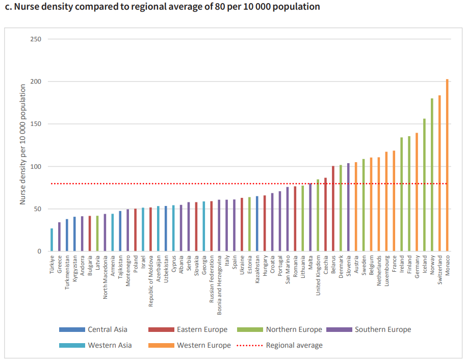 The role, the availability and the workload of DSNs is also inevitably affected by the current healthcare workforce shortage, a global phenomenon which also affects many European countries. Nurse shortage entails not having a sufficiently high nurse/patient ratio at the EU level. Based on the latest data available for 2022, the Region has on average 80 nurses per 10 000 people as shown on the graphic below [iii].