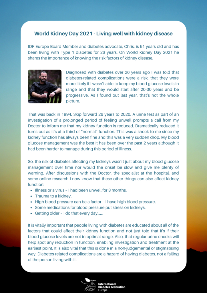 IDF Europe Board Member and diabetes advocate, Chris Aldred, spoke to us recently about the importance of people living with diabetes knowing the risk factors associated with kidney disease. Click the image below to download it.