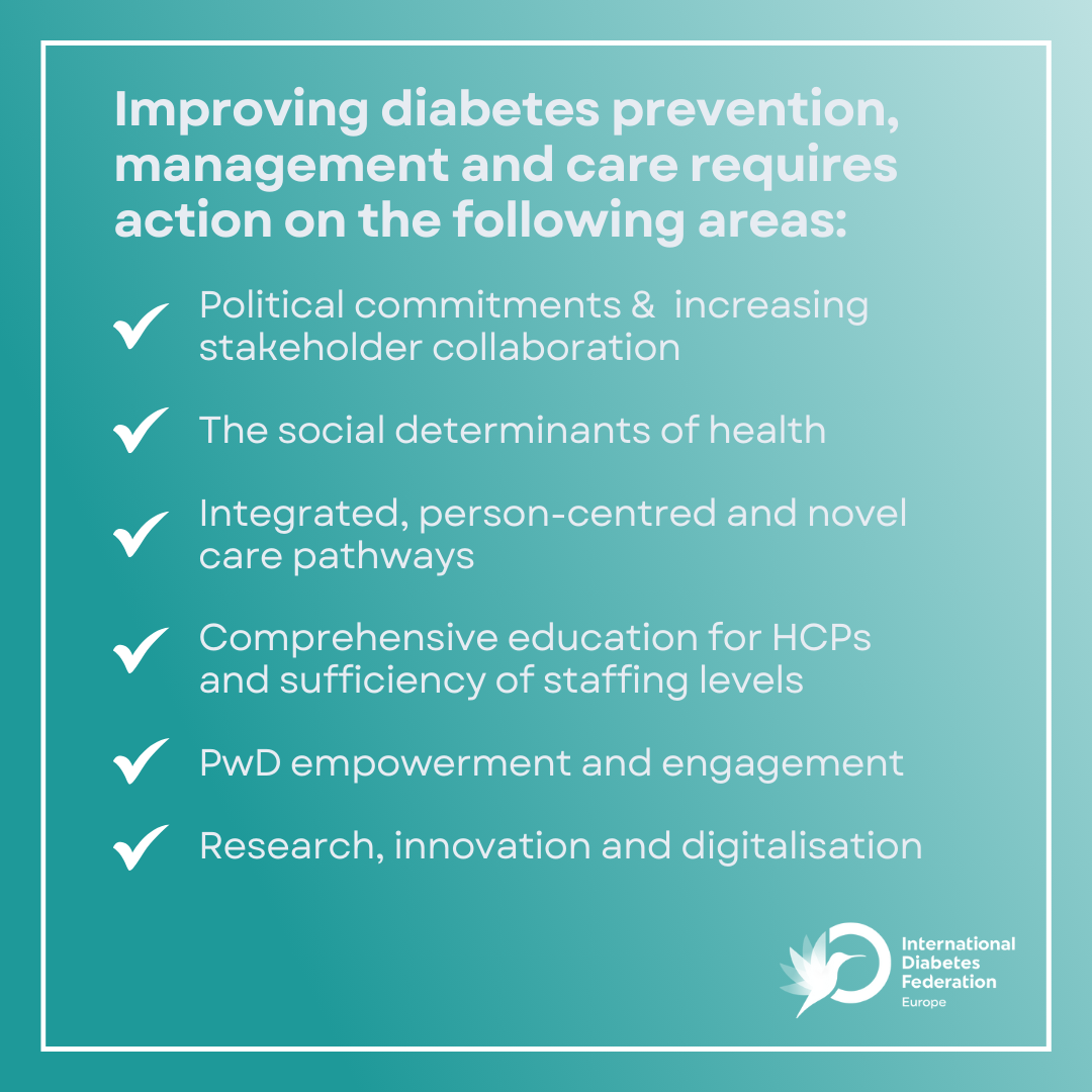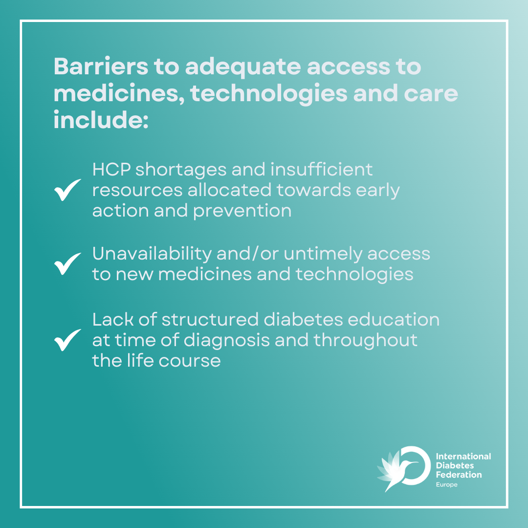 Diabetes is a hugely complex condition that can affect every organ system in the human body and which requires 24/7 management on the part of people living with it. To be able to optimally manage their condition, prevent the development of life-altering complications and achieve the best possible quality of life, all people living with diabetes (PwD) need access to early diagnosis and to the right treatment at the right time. This includes uninterrupted and affordable access to medicines, technologies, supplies and tools as well as the provision of self-management education and psychological support and adequate screening for complications. Today, great inequalities persist in access to health services for PwD within and between European countries as well as in medicines and technologies, resulting in an elevated risk for them of developing diabetes-related complications and a shortened life expectancy.