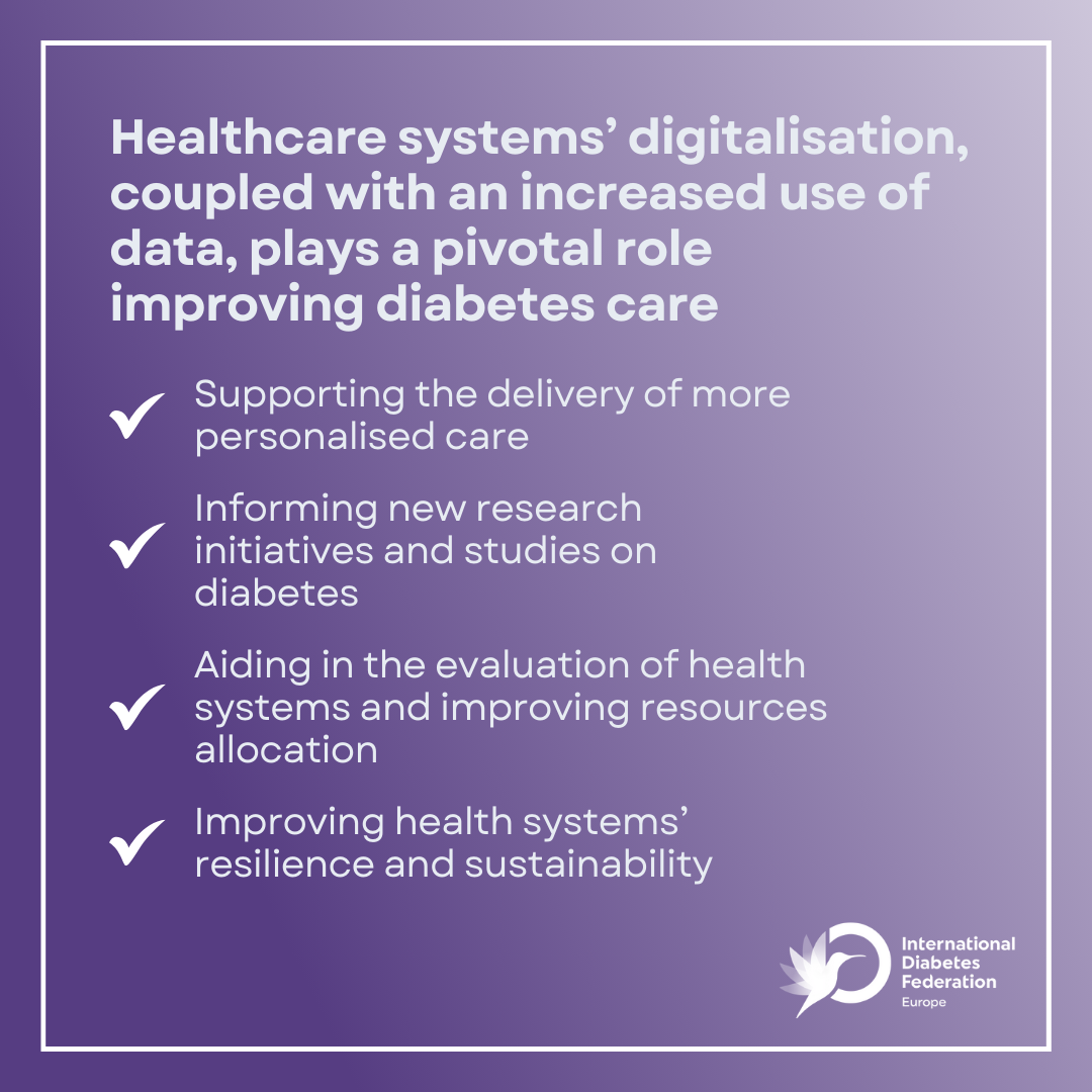 The digitalisation of healthcare systems, coupled with an increased use of data, new technologies, data analytics and AI, plays an essential role in the potential improvement in diabetes prevention, management and care.