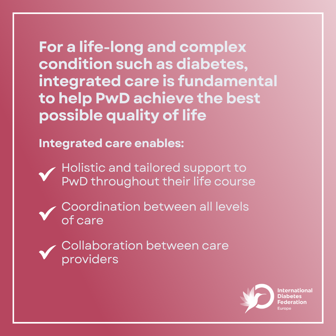 According to the WHO Regional Office for Europe’s definition, integrated care entails the comprehensive delivery of quality services across the life-course, designed according to the multidimensional needs of the population and the individual and delivered by a coordinated multidisciplinary team of providers working across settings and levels of care. For a life-long and complex condition such as diabetes, integrated care is fundamental to help PwD achieve optimal health outcomes and the best possible quality of life.