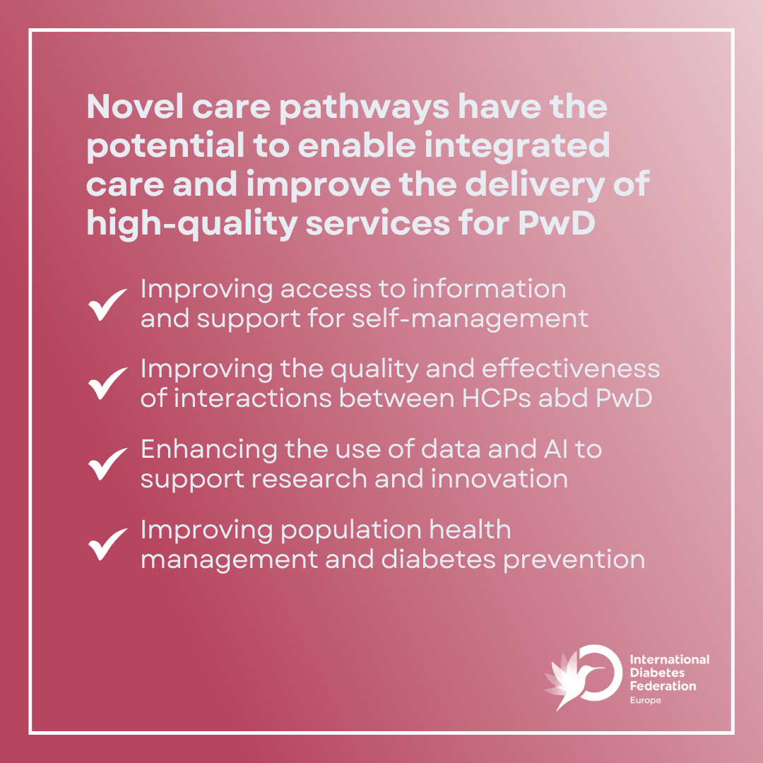 They can facilitate access to knowledge and information which is crucial for PwD who need to self-manage their condition 24/7 with limited input from HCPs, thereby empowering and supporting them in taking informed decisions. The need for sustained support for PwD can also be addressed by digital health models which integrate access to peer support groups. Remote monitoring/connections via digital platforms/tools, potentially removing the need for some face-to-face touch points while maintaining or increasing the frequency of contact, can also improve the quality and the effectiveness of interactions between HCPs and PwD, and subsequently free up human and financial resources for healthcare systems.